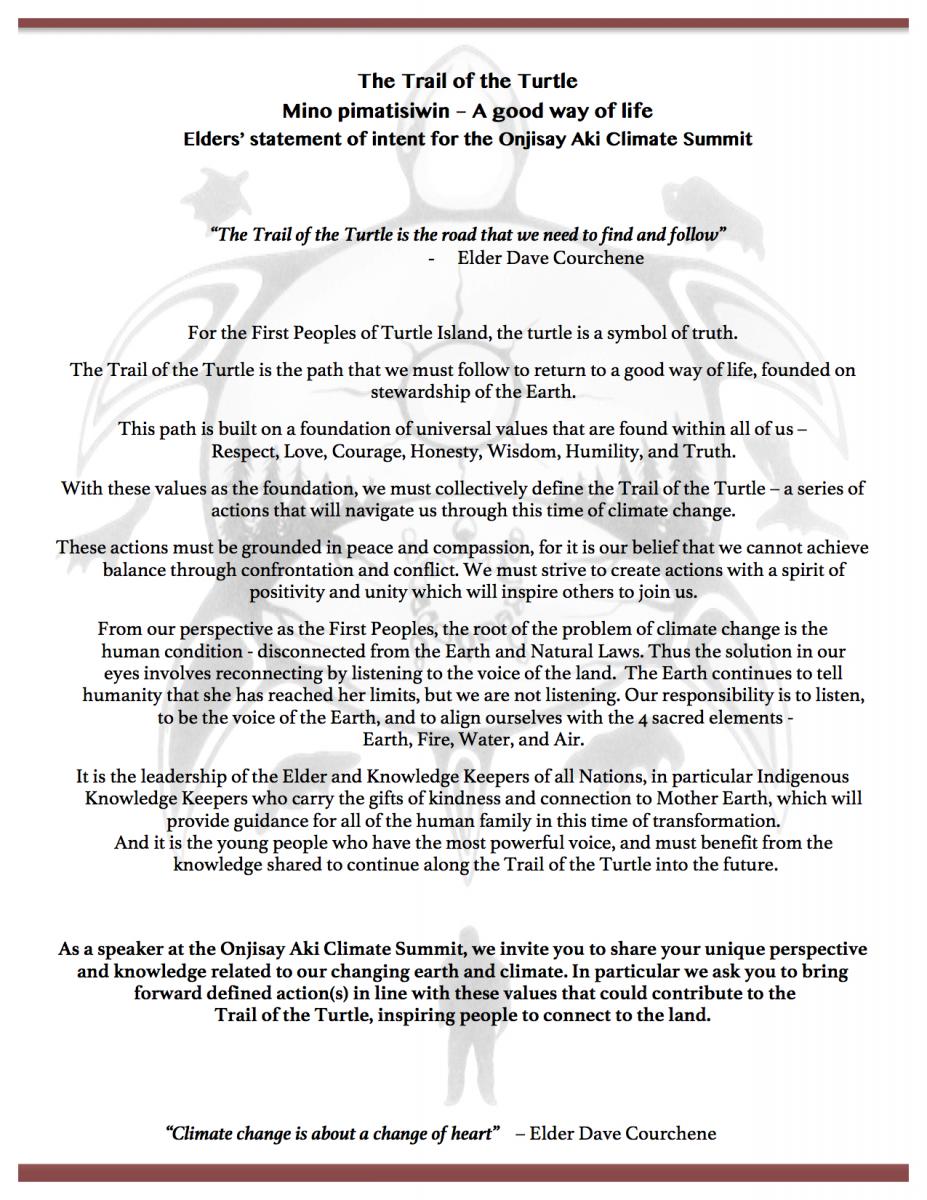 The Elders of Turtle Lodge have created a statement of values which will provide a foundation for the roundtable conversation at the Climate Summit. This statement describes the path that we need to take to return to a more sustainable way of life - the Trail of the Turtle.